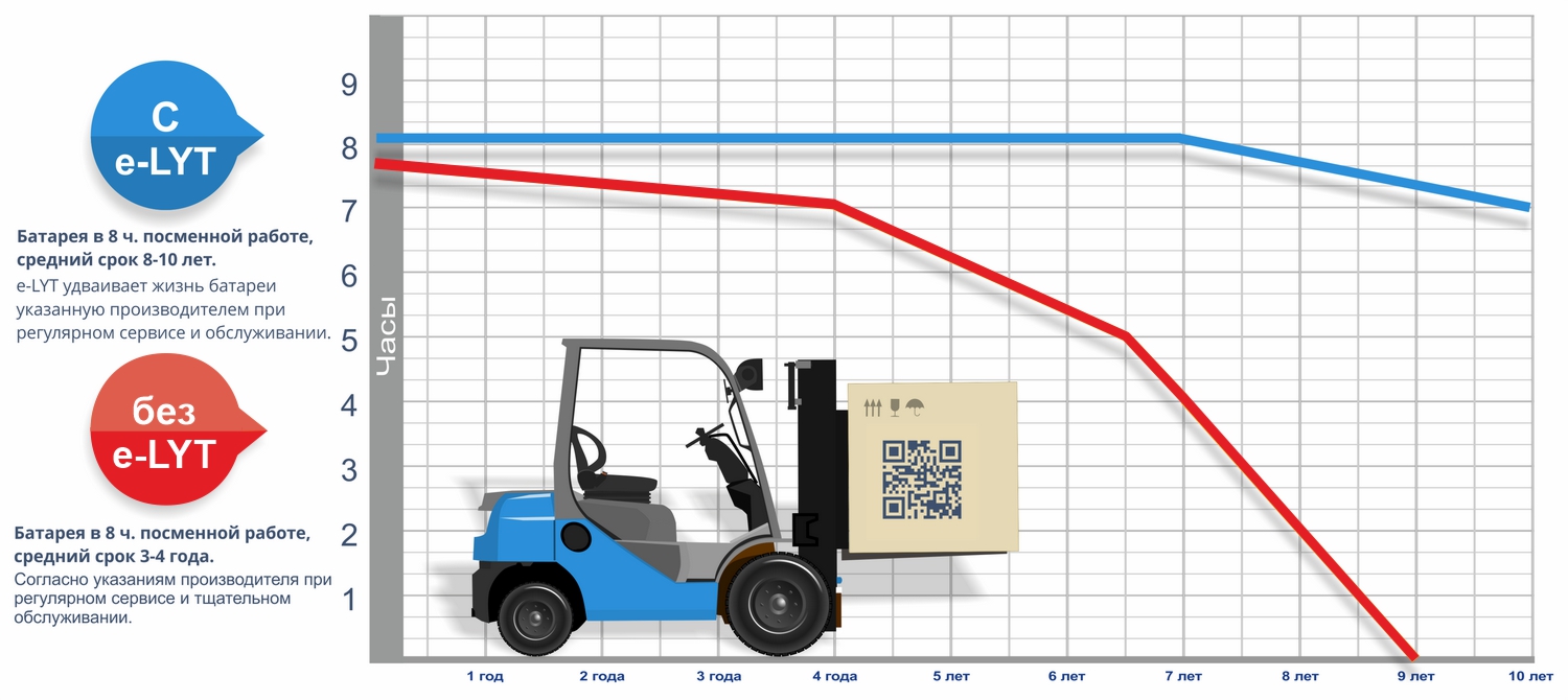 e-LYT с самого начала продлевает жизнь аккумуляторной батареи более чем на 100%.